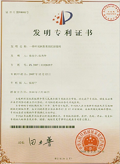 此專利于2007年向國家產(chǎn)權(quán)局提交發(fā)明專利申請,經(jīng)過長達兩年多的審核 認(rèn)證,于2010年2月通過審核環(huán)氧樹脂基阻尼封裝料專利證書,成功獲得該專利號:ZL2007 1 0192619.7