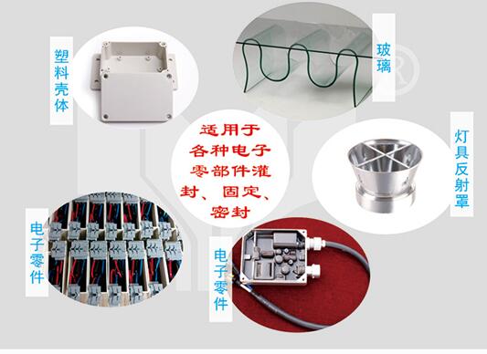 電子、燈具等常用的密封膠一般用來作粘結(jié)、絕緣、耐溫、防潮等用途。廣泛用于電加熱器、電熱管、儀表儀器、分析電極、電熱插頭、電熱器的粘合、密封、絕緣;設(shè)備管理的防腐及表面保護(hù)。