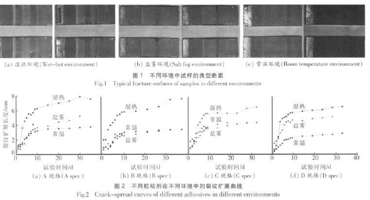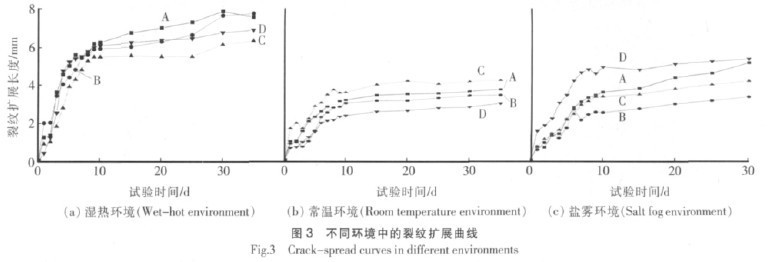 依次為 D>A>B>C 常溫環(huán)境中,種規(guī)格膠粘劑的裂紋擴(kuò)展由快到慢依次為 C>A>B>D; 鹽霧環(huán)境中,種規(guī)格膠粘劑的裂紋擴(kuò)展由快到慢依次為 D>A>C>B