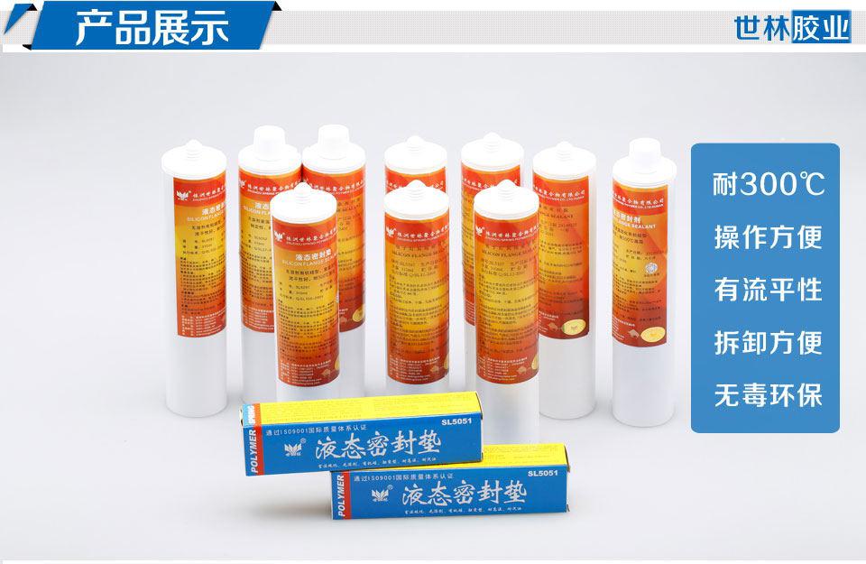 株洲世林膠業(yè)有一款SL5051耐300度液態(tài)密封膠,它是單組份有機(jī)硅密封膠,適用于飛機(jī)、汽車、摩托車等發(fā)動機(jī)、水泵、閥門、齒輪箱、減速箱、真空泵、空壓機(jī)等有關(guān)結(jié)合面,密封效果好,,耐水、耐汽油、耐機(jī)油、耐老化、具有優(yōu)良的耐介質(zhì)性能,室溫下即可硫化,使用起來非常方便。使用溫度為-60℃~+300℃,短時可達(dá)+350℃。目前已大批量的使用在了汽車發(fā)動機(jī)制造廠和航空發(fā)動機(jī)上。