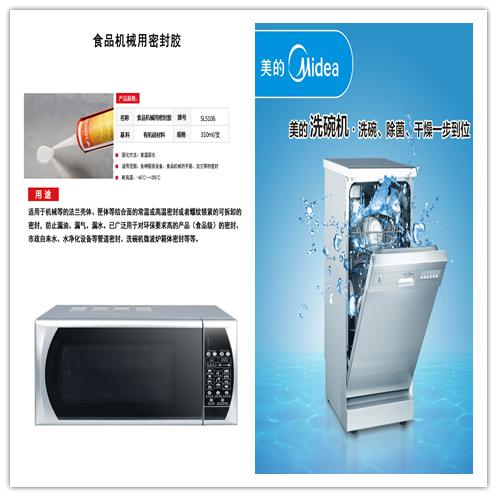 美的生產(chǎn)的洗碗機(jī)上就選用了世林膠業(yè)生產(chǎn)的SL5106食品級(jí)耐高溫密封膠,用在產(chǎn)品的間隙處,完全解決了耐高溫,防水,防塵,耐候性強(qiáng),可拆卸等問(wèn)題。